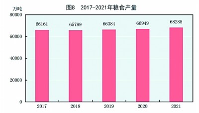 全年糧食產(chǎn)量68285萬(wàn)噸,比上年增加1336萬(wàn)噸,增產(chǎn)2.0%。其中,夏糧產(chǎn)量14596萬(wàn)噸,增產(chǎn)2.2%;早稻產(chǎn)量2802萬(wàn)噸,增產(chǎn)2.7%;秋糧產(chǎn)量50888萬(wàn)噸,增產(chǎn)1.9%。全年谷物產(chǎn)量63276萬(wàn)噸,比上年增產(chǎn)2.6%。其中,稻谷產(chǎn)量21284萬(wàn)噸,增產(chǎn)0.5%;小麥產(chǎn)量13695萬(wàn)噸,增產(chǎn)2.0%;玉米產(chǎn)量27255萬(wàn)噸,增產(chǎn)4.6%。(見(jiàn)圖8)