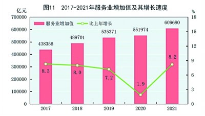 全年批發(fā)和零售業(yè)增加值110493億元,比上年增長(zhǎng)11.3%;交通運(yùn)輸、倉(cāng)儲(chǔ)和郵政業(yè)增加值47061億元,增長(zhǎng)12.1%;住宿和餐飲業(yè)增加值17853億元,增長(zhǎng)14.5%;金融業(yè)增加值91206億元,增長(zhǎng)4.8%;房地產(chǎn)業(yè)增加值77561億元,增長(zhǎng)5.2%;信息傳輸、軟件和信息技術(shù)服務(wù)業(yè)增加值43956億元,增長(zhǎng)17.2%;租賃和商務(wù)服務(wù)業(yè)增加值35350億元,增長(zhǎng)6.2%。全年規(guī)模以上服務(wù)業(yè)企業(yè)營(yíng)業(yè)收入比上年增長(zhǎng)18.7%,利潤(rùn)總額增長(zhǎng)13.4%。(見(jiàn)圖11)