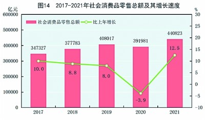 全年社會(huì)消費(fèi)品零售總額440823億元,比上年增長(zhǎng)12.5%。按經(jīng)營(yíng)地統(tǒng)計(jì),城鎮(zhèn)消費(fèi)品零售額381558億元,增長(zhǎng)12.5%;鄉(xiāng)村消費(fèi)品零售額59265億元,增長(zhǎng)12.1%。按消費(fèi)類型統(tǒng)計(jì),商品零售額393928億元,增長(zhǎng)11.8%;餐飲收入額46895億元,增長(zhǎng)18.6%。(見(jiàn)圖14)