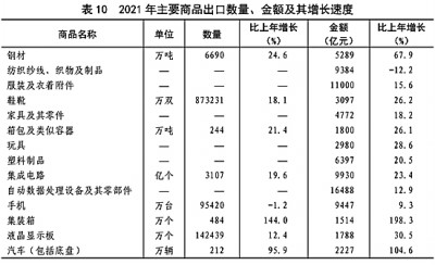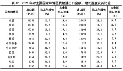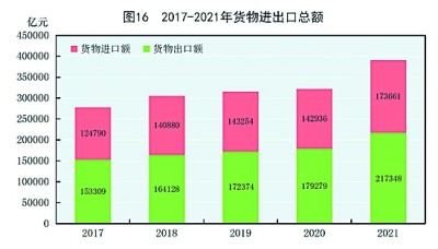 全年貨物進(jìn)出口總額391009億元,比上年增長(zhǎng)21.4%。其中,出口217348億元,增長(zhǎng)21.2%;進(jìn)口173661億元,增長(zhǎng)21.5%。貨物進(jìn)出口順差43687億元,比上年增加7344億元。對(duì)“一帶一路”[44]沿線國(guó)家進(jìn)出口總額115979億元,比上年增長(zhǎng)23.6%。其中,出口65924億元,增長(zhǎng)21.5%;進(jìn)口50055億元,增長(zhǎng)26.4%。(見(jiàn)圖16)(見(jiàn)表9)(見(jiàn)表10)(見(jiàn)表11)(見(jiàn)表12)