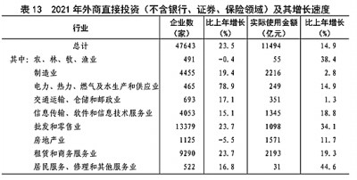 全年外商直接投資(不含銀行、證券、保險(xiǎn)領(lǐng)域)新設(shè)立企業(yè)47643家,比上年增長(zhǎng)23.5%。實(shí)際使用外商直接投資金額11494億元,增長(zhǎng)14.9%,折1735億美元,增長(zhǎng)20.2%。其中“一帶一路”沿線國(guó)家對(duì)華直接投資(含通過(guò)部分自由港對(duì)華投資)新設(shè)立企業(yè)5336家,增長(zhǎng)24.3%;對(duì)華直接投資金額743億元,增長(zhǎng)29.4%,折112億美元,增長(zhǎng)36.0%。全年高技術(shù)產(chǎn)業(yè)實(shí)際使用外資3469億元,增長(zhǎng)17.1%,折522億美元,增長(zhǎng)22.1%。(見(jiàn)表13)