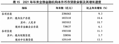 全年社會(huì)融資規(guī)模增量[45]31.4萬(wàn)億元,按可比口徑計(jì)算,比上年少3.4萬(wàn)億元。年末社會(huì)融資規(guī)模存量[46]314.1萬(wàn)億元,按可比口徑計(jì)算,比上年末增長(zhǎng)10.3%,其中對(duì)實(shí)體經(jīng)濟(jì)發(fā)放的人民幣貸款余額191.5萬(wàn)億元,增長(zhǎng)11.6%。年末全部金融機(jī)構(gòu)本外幣各項(xiàng)存款余額238.6萬(wàn)億元,比年初增加20.2萬(wàn)億元,其中人民幣各項(xiàng)存款余額232.3萬(wàn)億元,增加19.7萬(wàn)億元。全部金融機(jī)構(gòu)本外幣各項(xiàng)貸款余額198.5萬(wàn)億元,增加20.1萬(wàn)億元,其中人民幣各項(xiàng)貸款余額192.7萬(wàn)億元,增加19.9萬(wàn)億元。人民幣普惠金融貸款[47]余額26.5萬(wàn)億元,增加5.0萬(wàn)億元。(見(jiàn)表15)