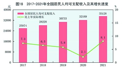 全年全國(guó)居民人均可支配收入35128元,比上年增長(zhǎng)9.1%,扣除價(jià)格因素,實(shí)際增長(zhǎng)8.1%。全國(guó)居民人均可支配收入中位數(shù)[53]29975元,增長(zhǎng)8.8%。按常住地分,城鎮(zhèn)居民人均可支配收入47412元,比上年增長(zhǎng)8.2%,扣除價(jià)格因素,實(shí)際增長(zhǎng)7.1%。城鎮(zhèn)居民人均可支配收入中位數(shù)43504元,增長(zhǎng)7.7%。農(nóng)村居民人均可支配收入18931元,比上年增長(zhǎng)10.5%,扣除價(jià)格因素,實(shí)際增長(zhǎng)9.7%。農(nóng)村居民人均可支配收入中位數(shù)16902元,增長(zhǎng)11.2%。城鄉(xiāng)居民人均可支配收入比值為2.50,比上年縮小0.06。按全國(guó)居民五等份收入分組[54],低收入組人均可支配收入8333元,中間偏下收入組人均可支配收入18445元,中間收入組人均可支配收入29053元,中間偏上收入組人均可支配收入44949元,高收入組人均可支配收入85836元。全國(guó)農(nóng)民工人均月收入4432元,比上年增長(zhǎng)8.8%。全年脫貧縣[55]農(nóng)村居民人均可支配收入14051元,比上年增長(zhǎng)11.6%,扣除價(jià)格因素,實(shí)際增長(zhǎng)10.8%。