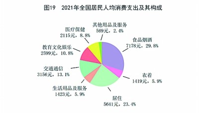 全年全國(guó)居民人均消費(fèi)支出24100元,比上年增長(zhǎng)13.6%,扣除價(jià)格因素,實(shí)際增長(zhǎng)12.6%。其中,人均服務(wù)性消費(fèi)支出[56]10645元,比上年增長(zhǎng)17.8%,占居民人均消費(fèi)支出的比重為44.2%。按常住地分,城鎮(zhèn)居民人均消費(fèi)支出30307元,增長(zhǎng)12.2%,扣除價(jià)格因素,實(shí)際增長(zhǎng)11.1%;農(nóng)村居民人均消費(fèi)支出15916元,增長(zhǎng)16.1%,扣除價(jià)格因素,實(shí)際增長(zhǎng)15.3%。全國(guó)居民恩格爾系數(shù)為29.8%,其中城鎮(zhèn)為28.6%,農(nóng)村為32.7%。(見(jiàn)圖18)(見(jiàn)圖19)