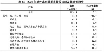 全年對(duì)外非金融類直接投資額7332億元,比上年下降3.5%,折1136億美元,增長(zhǎng)3.2%。其中,對(duì)“一帶一路”沿線國(guó)家非金融類直接投資額203億美元,增長(zhǎng)14.1%。(見(jiàn)表14)