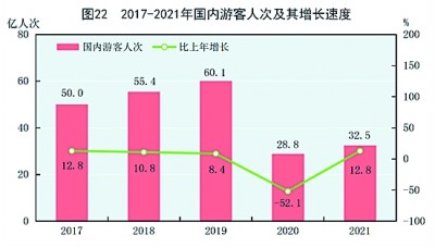 全年國(guó)內(nèi)游客32.5億人次,比上年增長(zhǎng)12.8%。其中,城鎮(zhèn)居民游客23.4億人次,增長(zhǎng)13.4%;農(nóng)村居民游客9.0億人次,增長(zhǎng)11.1%。國(guó)內(nèi)旅游收入29191億元,增長(zhǎng)31.0%。其中,城鎮(zhèn)居民游客花費(fèi)23644億元,增長(zhǎng)31.6%;農(nóng)村居民游客花費(fèi)5547億元,增長(zhǎng)28.4%。(見(jiàn)圖22)