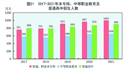 [65]普通、職業(yè)本專科包括普通本科、職業(yè)本科、高職(專科)。2021年高職(專科)招生人數(shù)統(tǒng)計(jì)口徑發(fā)生變化,包含五年制高職轉(zhuǎn)入專科招生人數(shù)。