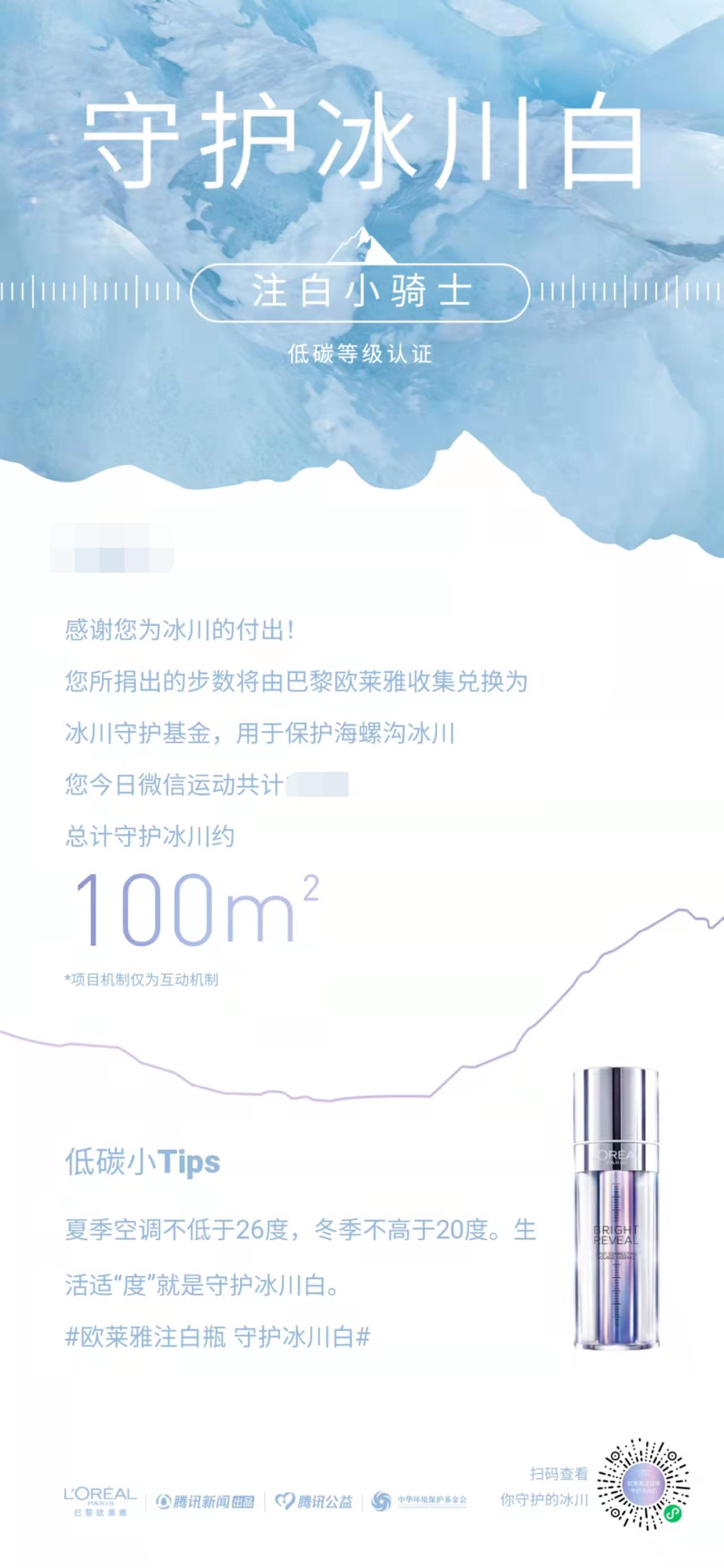 為了能更好地體現“守護肌膚凈白”的理念,巴黎歐萊雅和新聞機構還共同發起了“守護冰川白”公益事件,據悉,注白瓶保護冰川的初衷是“守護肌膚凈白,也守護地球最后一片凈白”。該活動旨在通過呼吁低碳生活方式,促進減排并由此為保護冰川貢獻力量。