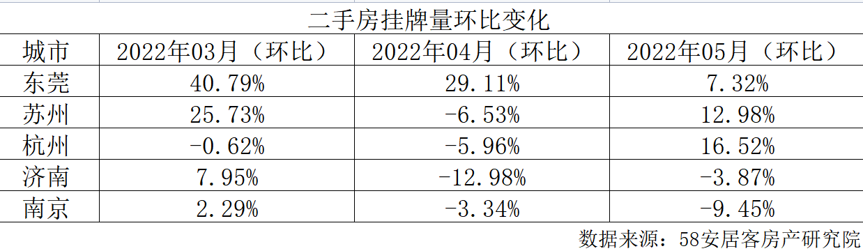 58安居客房產研究院首席分析師張波對第一財經表示,因為3、4月份的快速增長,東莞市二手房掛牌量已經處于高位,所以5月份沒有明顯的增長,東莞的政策對市場的影響還沒有完全釋放出來。