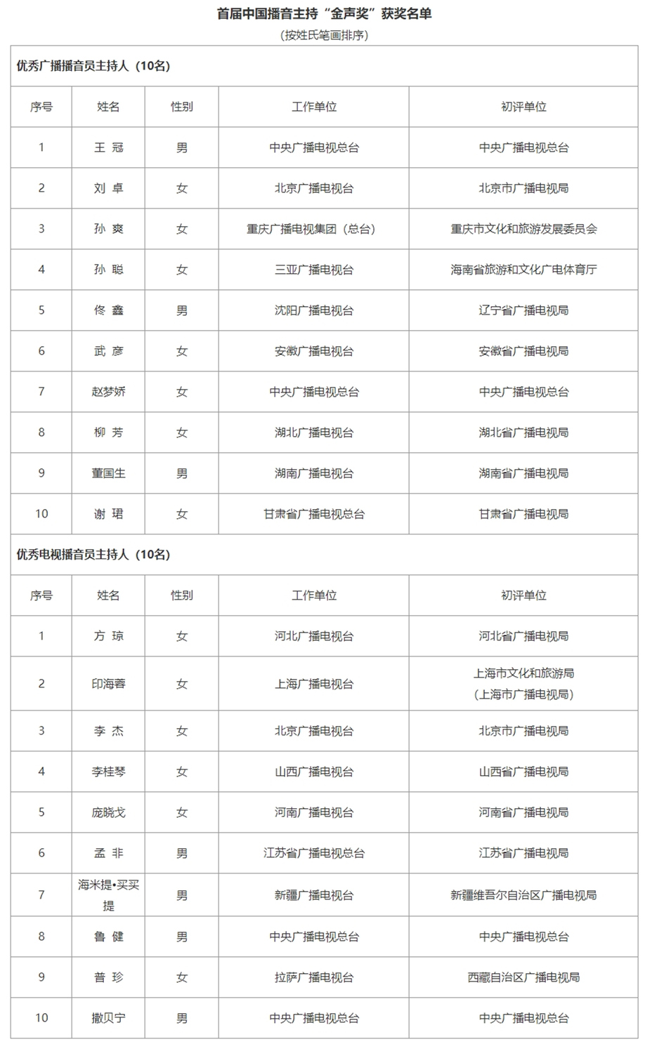 中新網8月8日電 據國家廣播電視總局網站消息,中國電視藝術委員會8日公布首屆中國播音主持“金聲獎”獲獎名單。共有10名優秀廣播播音員主持人、10名優秀電視播音員主持人獲獎,其中包括中央廣播電視總臺的撒貝寧,以及江蘇省廣播電視總臺的孟非等人。