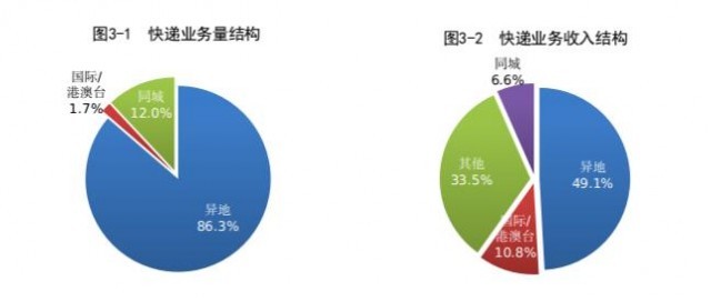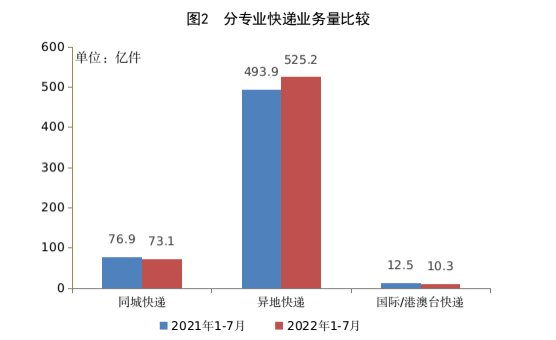 1-7月,同城、異地、國際/港澳臺快遞業務量分別占全部快遞業務量的12.0%、86.3%和1.7%;業務收入分別占全部快遞業務收入的6.6%、49.1%和10.8%。與去年同期相比,同城快遞業務量的比重下降1.2個百分點,異地快遞業務量的比重上升1.6個百分點,國際/港澳臺業務量的比重下降0.4個百分點。