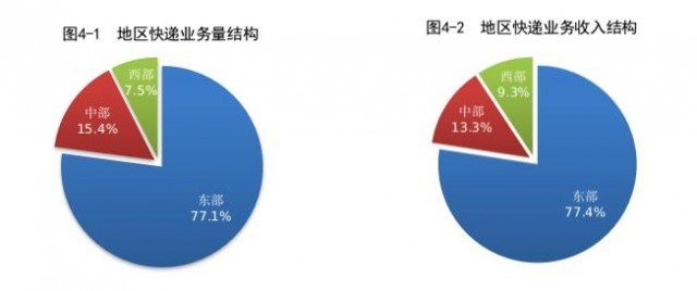 1-7月,東、中、西部地區快遞業務量比重分別為77.1%、15.4%和7.5%,業務收入比重分別為77.4%、13.3%和9.3%。與去年同期相比,東部地區快遞業務量比重下降1.5個百分點,快遞業務收入比重下降1.1個百分點;中部地區快遞業務量比重上升1.2個百分點,快遞業務收入比重上升0.6個百分點;西部地區快遞業務量比重上升0.3個百分點,快遞業務收入比重上升0.5個百分點。