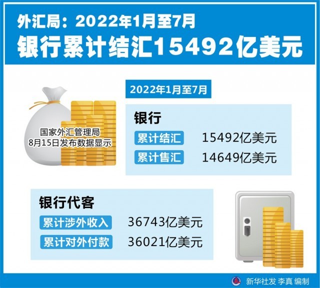 新華社北京8月15日電(記者劉開雄)國家外匯管理局15日發布數據顯示,今年1月至7月,銀行累計結匯15492億美元,累計售匯14649億美元;銀行代客累計涉外收入36743億美元,累計對外付款36021億美元。