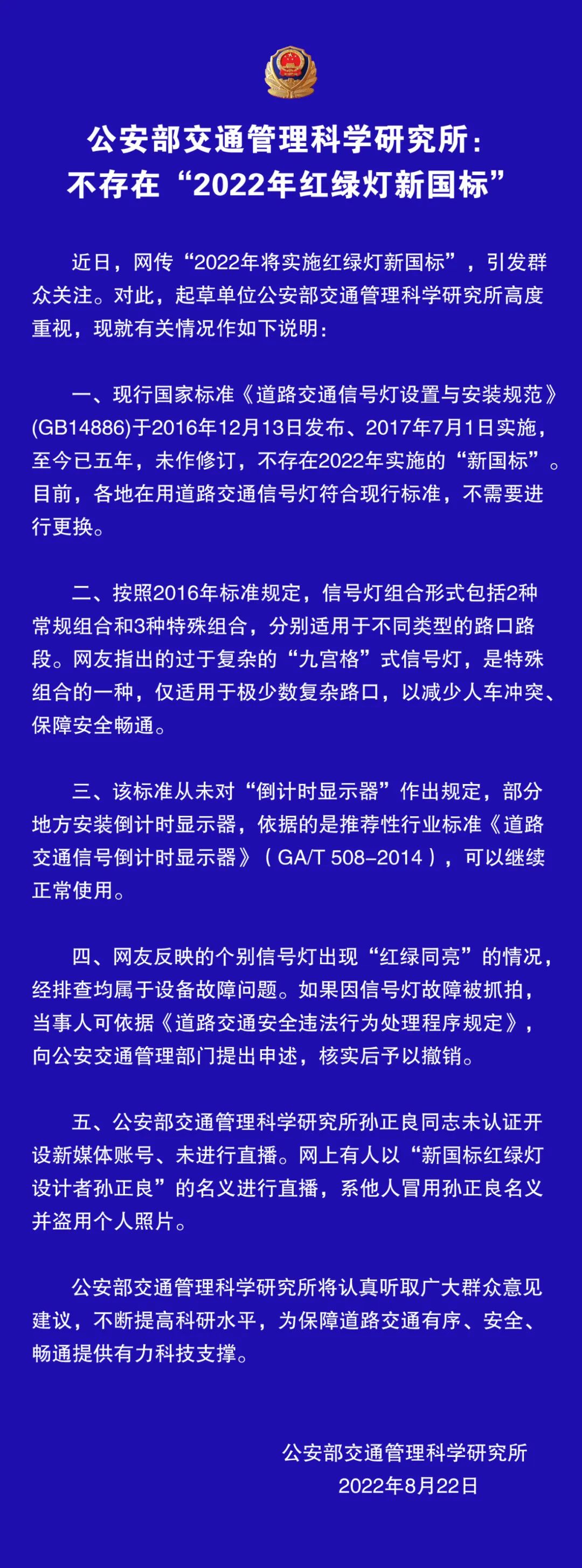 公安部交通管理科學(xué)研究所:不存在“2022年紅綠燈新國標”!