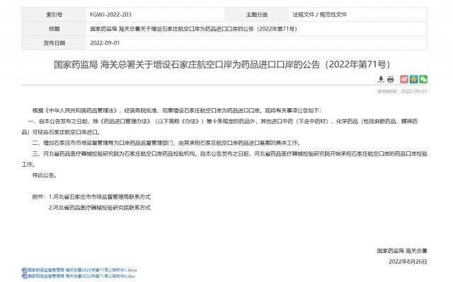 國家藥監局、海關總署:增設石家莊航空口岸為藥品進口口岸