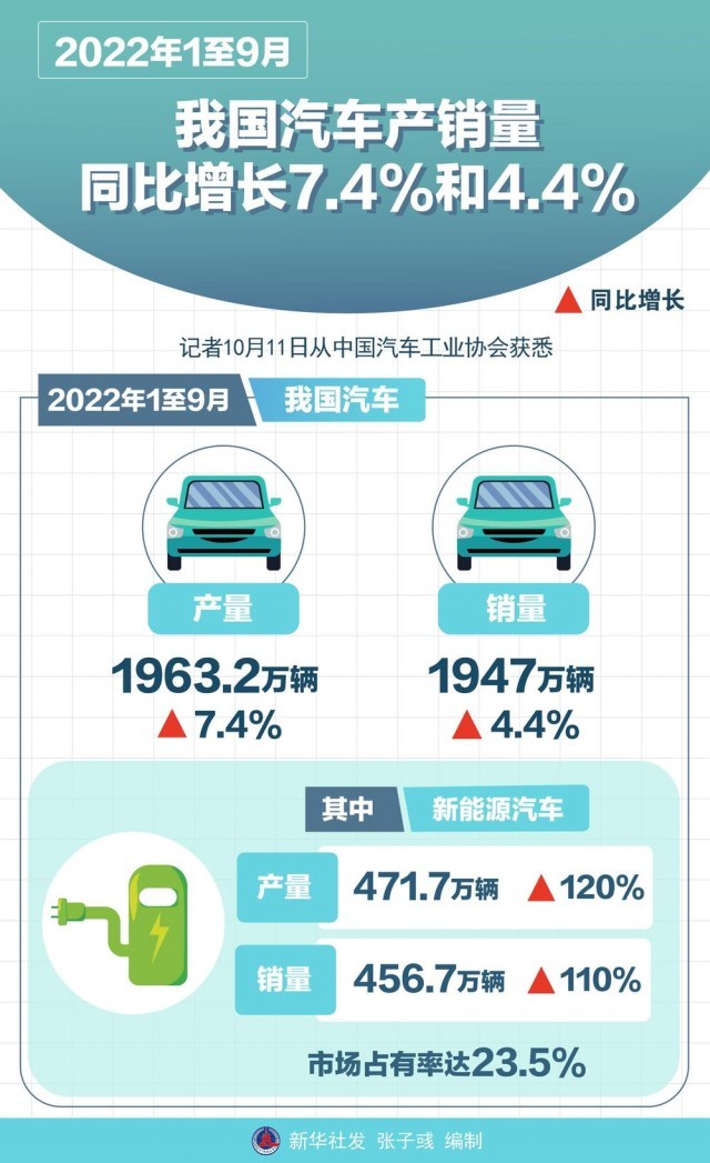 新華社北京10月11日電(記者高亢、戴小河)記者11日從中國汽車工業(yè)協(xié)會獲悉,今年1至9月,我國汽車產(chǎn)銷量分別達(dá)1963.2萬輛和1947萬輛,同比增長7.4%和4.4%。其中,新能源汽車產(chǎn)銷量分別達(dá)471.7萬輛和456.7萬輛,同比增長120%和110%,市場占有率達(dá)23.5%。