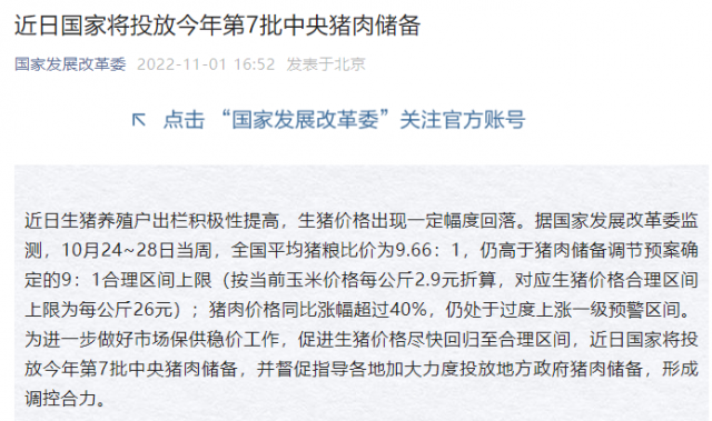 國家發展改革委:近日國家將投放今年第7批中央豬肉儲備