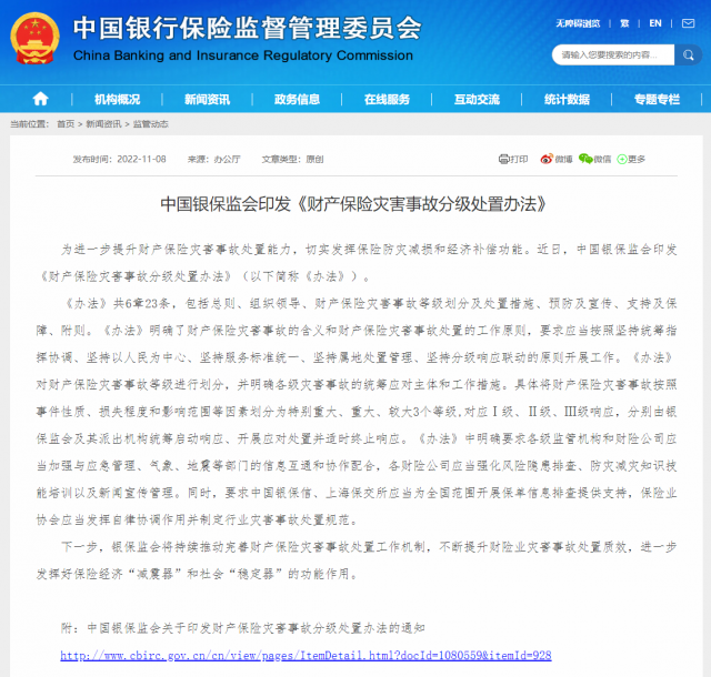 銀保監會網站11月8日消息,為進一步提升財產保險災害事故處置能力,切實發揮保險防災減損和經濟補償功能。近日,中國銀保監會印發《財產保險災害事故分級處置辦法》(以下簡稱《辦法》)。