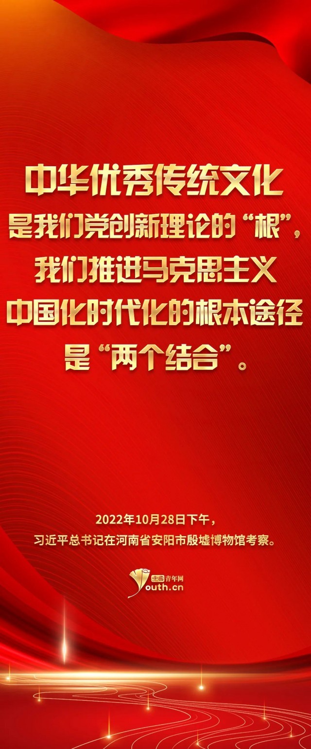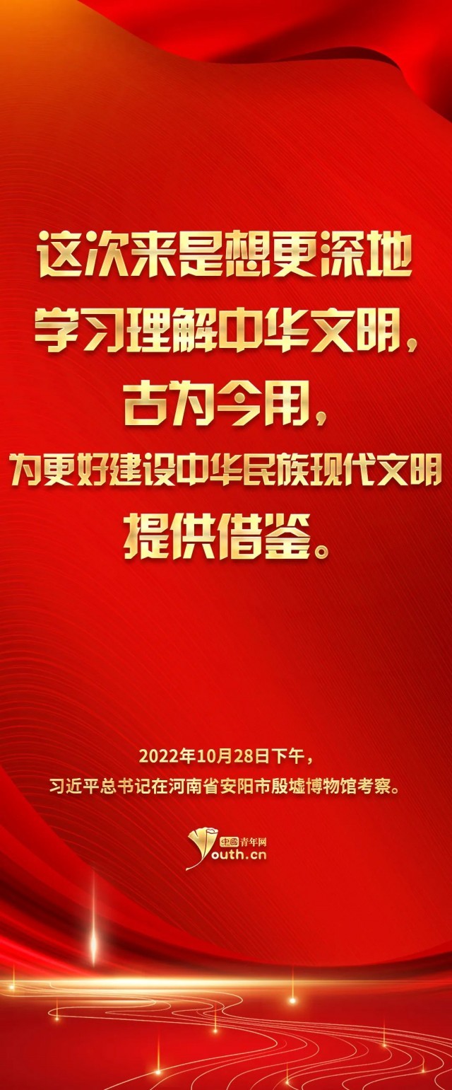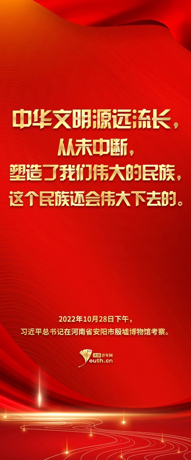 參天之木,必有其根;懷山之水,必有其源。習(xí)總書記的這次殷墟考察之行,讓我們將目光再次聚焦到中華民族的傳統(tǒng)文化之上。青山百代,仍蔭后人。正如習(xí)總書記指出的——中華優(yōu)秀傳統(tǒng)文化是我們黨創(chuàng)新理論的“根”,我們推進(jìn)馬克思主義中國化時代化的根本途徑是“兩個結(jié)合”——民族要獨立自強,國家欲穩(wěn)步發(fā)展,文化是來自深處的支撐。作為當(dāng)代青年,我們理應(yīng)響應(yīng)時代號召,跟隨習(xí)近平總書記的腳步,去深入了解學(xué)習(xí)中華文明,兼顧歷史之沉淀與時代之新意,在向世界發(fā)揚中華氣象的同時,也邀得當(dāng)年之明月照徹今人。