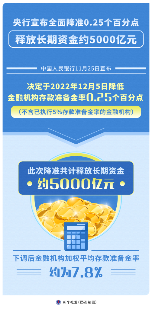 11月25日中國人民銀行宣布,決定于2022年12月5日降低金融機構存款準備金率0.25個百分點(不含已執行5%存款準備金率的金融機構)。這是年內第二次降準,今年首次降準已在4月落地。兩次降準共降低金融機構存款準備金率0.5個百分點、釋放長期資金超萬億元,金融機構加權平均存款準備金率降至約7.8%。