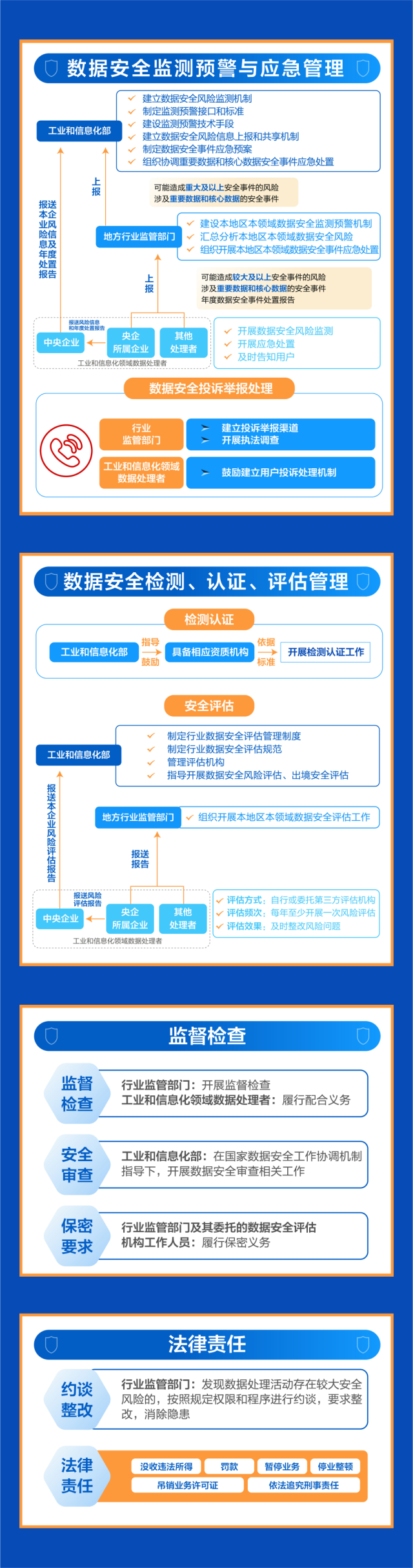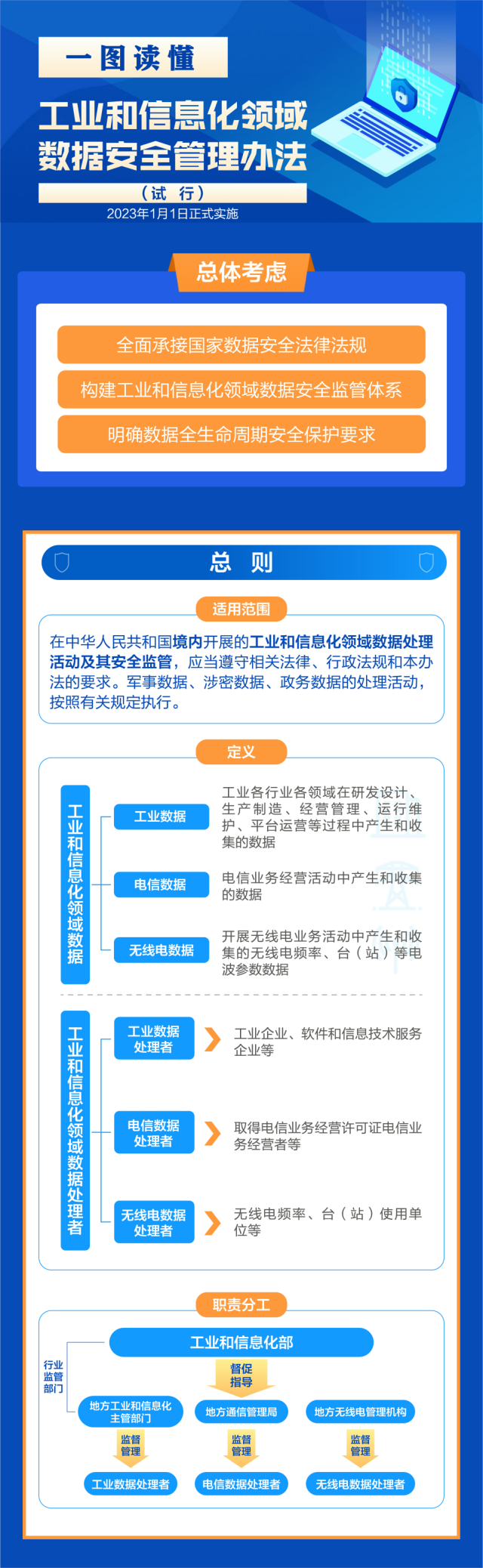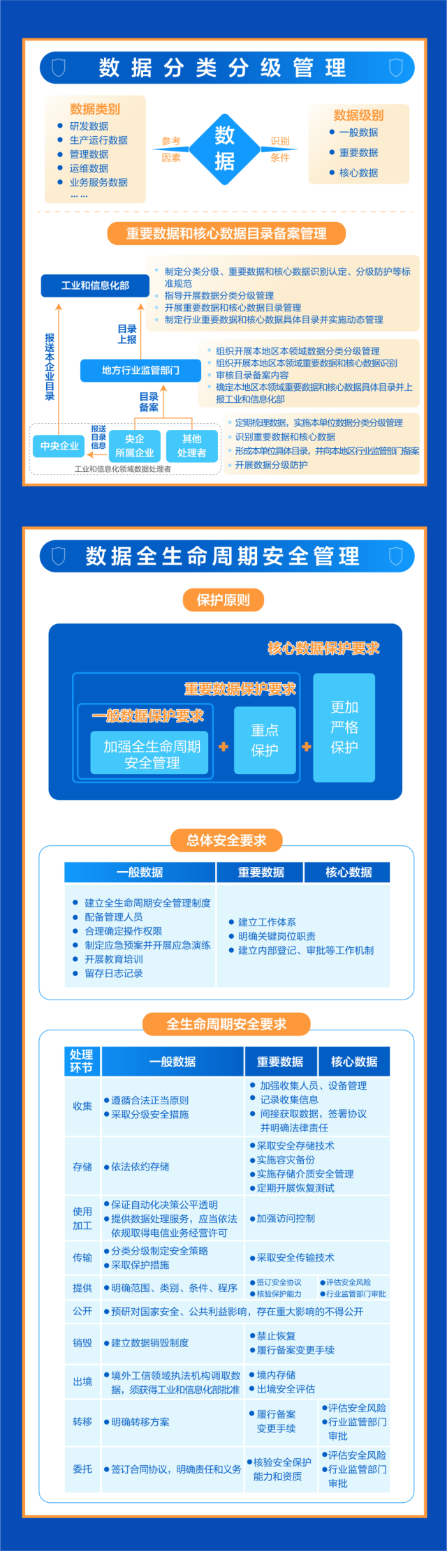 《管理辦法》以數據分級保護為總體原則,要求一般數據加強全生命周期安全管理,重要數據在一般數據保護的基礎上進行重點保護,核心數據在重要數據保護的基礎上實施更加嚴格保護。對于不同級別數據同時被處理且難以分別采取保護措施的,采取“就高”原則,按照其中級別最高的要求實施保護。