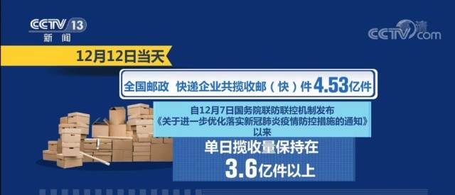 國家郵政局?jǐn)?shù)據(jù)顯示,12月1日—12日,郵政快遞行業(yè)攬收量約為43.03億件,同比上升5.6%。12月12日當(dāng)天,全國郵政、快遞企業(yè)共攬收郵(快)件4.53億件。自12月7日國務(wù)院聯(lián)防聯(lián)控機制發(fā)布《關(guān)于進(jìn)一步優(yōu)化落實新冠肺炎疫情防控措施的通知》以來,單日攬收量保持在3.6億件以上。