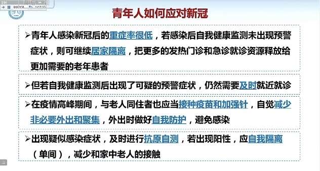 青年人如何應對新冠?鐘南山說,青年人感染新冠后的重癥率非常低,如果感染,建議居家隔離,把更多的發熱門診和急診資源釋放給更加需要的老年患者。如果自我監測后出現了可疑的癥狀,仍然需要及時就近就診。在疫情高峰期,與老人同住者也應當接種疫苗和加強針,自覺減少非必要外出和聚集,外出時做好自我防護,避免感染。他說,“我的外孫女前幾天得了,3天就恢復了。”