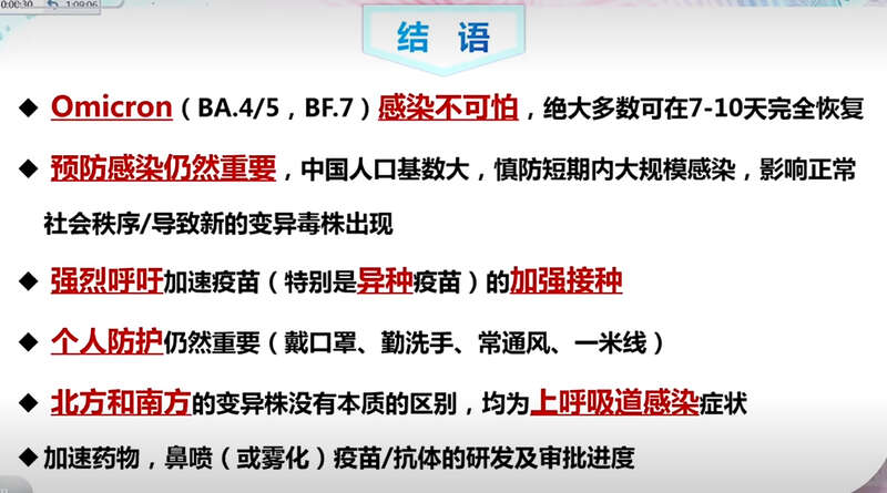 現在有種說法“早也陽、晚也陽,不如大家一起陽”,鐘南山認為這種觀念不可取。陽不可怕,但預防感染非常重要,因為中國人口基數大,要慎防短期內大規模感染發生,以免影響正常社會秩序或導致新的變異毒株出現。鐘南山強烈呼吁加速疫苗(特別是異種疫苗)的加強接種。