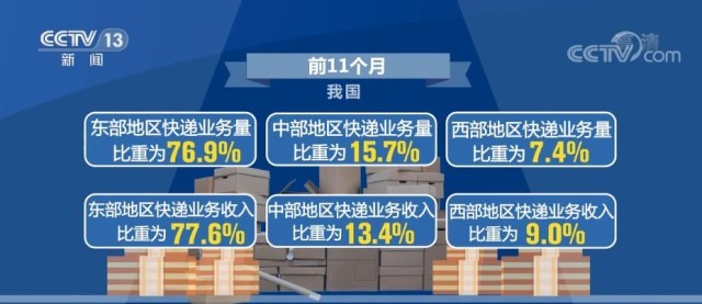 前11個月,我國東、中、西部地區快遞業務量比重分別為76.9%、15.7%和7.4%,業務收入比重分別為77.6%、13.4%和9.0%。與去年同期相比,東部地區快遞業務量比重下降1.3個百分點,快遞業務收入比重下降0.6個百分點。中部地區快遞業務量比重上升1.2個百分點,快遞業務收入比重上升0.5個百分點。西部地區快遞業務量比重上升0.1個百分點,快遞業務收入比重上升0.1個百分點。
