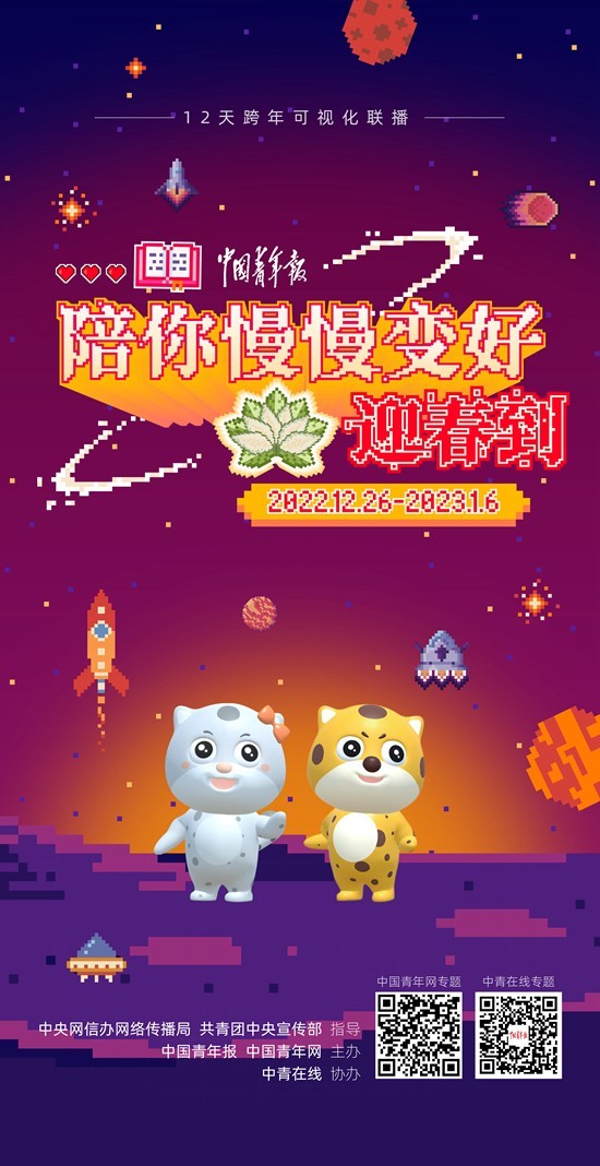 本報北京12月25日電(中青報·中青網記者 尹希寧)一場連續12天的飛揚之旅即將開啟——2022年12月26日至2023年1月6日,中國青年報社將在全媒體平臺推出“陪你慢慢變好·迎春到”跨年可視化聯播活動,邀請年輕的朋友在云端點亮雪蓮花,共同迎接2023年。