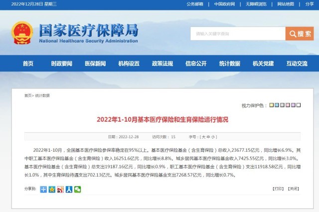 央視網(wǎng)消息:國(guó)家醫(yī)療保障局網(wǎng)站12月28日消息,2022年1-10月,全國(guó)基本醫(yī)療保險(xiǎn)參保率穩(wěn)定在95%以上。基本醫(yī)療保險(xiǎn)基金(含生育保險(xiǎn))總收入23677.15億元,同比增長(zhǎng)6.9%。其中職工基本醫(yī)療保險(xiǎn)基金(含生育保險(xiǎn))收入16251.6億元,同比增長(zhǎng)8.8%。城鄉(xiāng)居民基本醫(yī)療保險(xiǎn)基金收入7425.55億元,同比增長(zhǎng)3.0%。基本醫(yī)療保險(xiǎn)基金(含生育保險(xiǎn))總支出19187.16億元,同比增長(zhǎng)0.9%,職工基本醫(yī)療保險(xiǎn)基金(含生育保險(xiǎn))支出11918.58億元,同比增長(zhǎng)1.0%,其中生育保險(xiǎn)待遇支出702.13億元。城鄉(xiāng)居民基本醫(yī)療保險(xiǎn)基金支出7268.57億元,同比增長(zhǎng)0.7%。