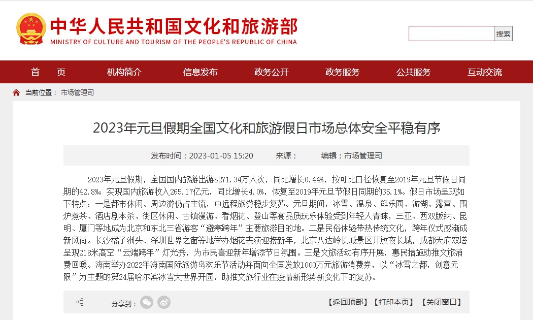 據介紹,2023年元旦假期,全國國內旅游出游5271.34萬人次,同比增長0.44%,按可比口徑恢復至2019年元旦節假日同期的42.8%;實現國內旅游收入265.17億元,同比增長4.0%,恢復至2019年元旦節假日同期的35.1%。