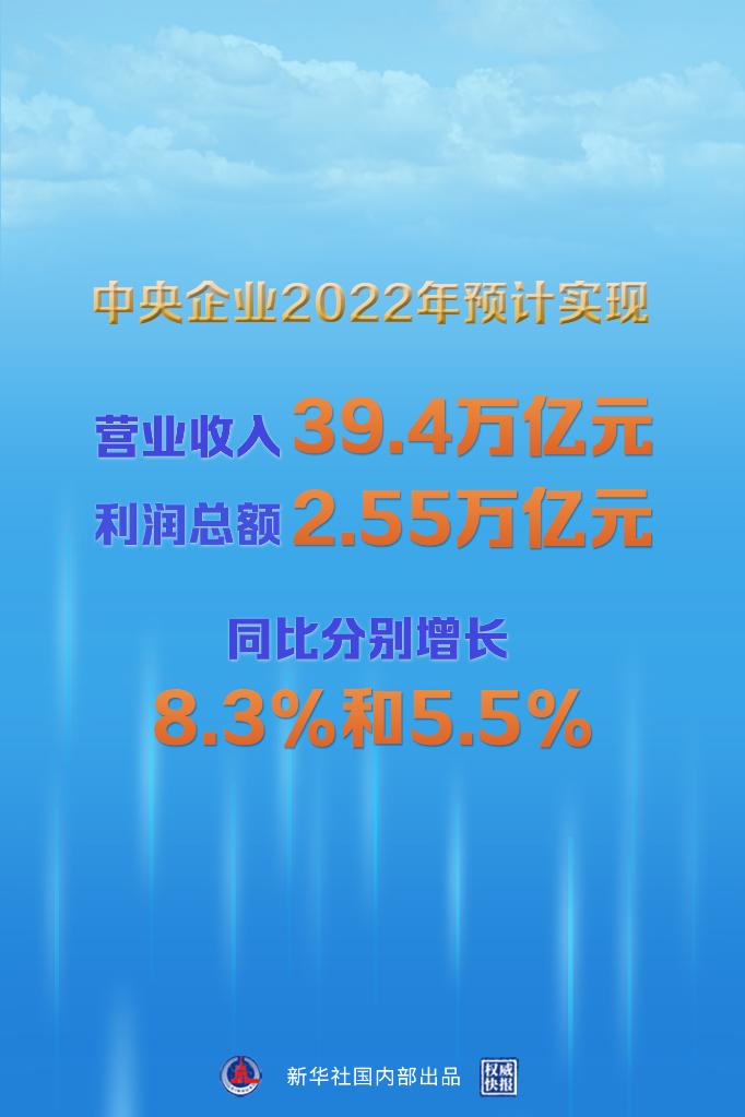 新華社北京1月5日電(記者王希)2022年,國資央企統籌疫情防控和企業生產經營,統籌發展和安全,推動經濟運行實現穩中有進,中央企業全年預計實現營業收入39.4萬億元、利潤總額2.55萬億元,同比分別增長8.3%和5.5%。