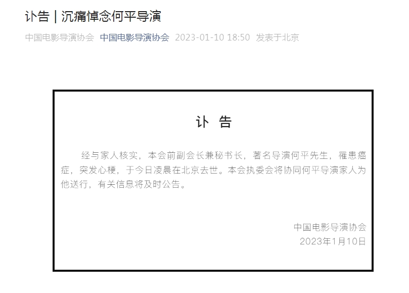 中新網1月10日電 據中國電影導演協會消息,經與家人核實,中國電影導演協會前副會長兼秘書長,著名導演何平先生,罹患癌癥,突發心梗,于1月10日凌晨在北京去世。中國電影導演協會執委會將協同何平導演家人為他送行,有關信息將及時公告。