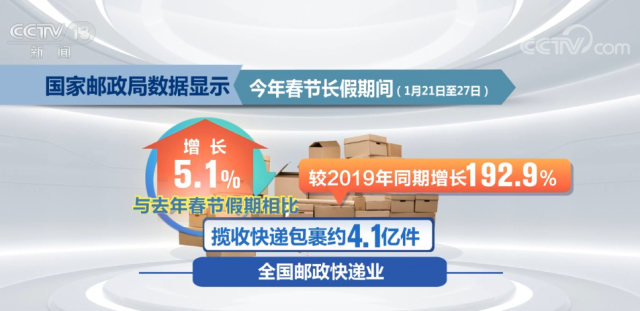 國家郵政局數據顯示,今年春節長假期間(1月21日至27日),全國郵政快遞業攬收快遞包裹約4.1億件,與去年春節假期相比增長5.1%,較2019年同期增長192.9%;投遞快遞包裹3.3億件,與去年春節假期相比增長10.0%,較2019年同期增長254.8%。