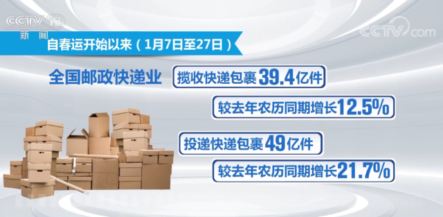 數據顯示,自春運開始以來(1月7日至27日),全國郵政快遞業攬收快遞包裹39.4億件,較去年農歷同期增長12.5%;投遞快遞包裹49億件,較去年農歷同期增長21.7%。