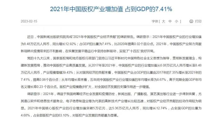 國家版權局:2021中國版權產(chǎn)業(yè)增加值占GDP7.41%