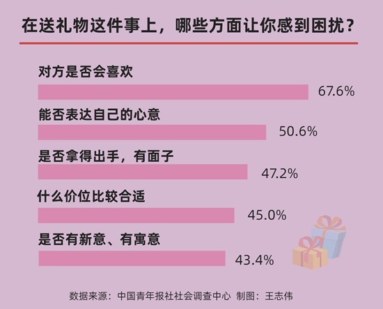 中國青年報社社會調查中心的調查顯示,在送禮物上,69.9%的受訪青年感到有困擾,且男生有困擾的比例高于女生,這也從一定程度上反映出男生在禮物選擇和情感表達上更為糾結。