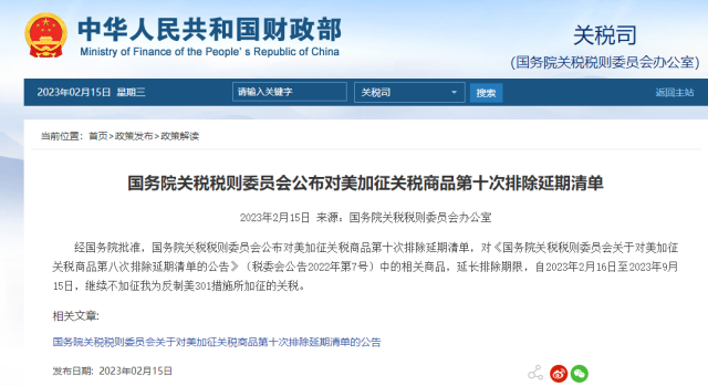 經國務院批準,國務院關稅稅則委員會公布對美加征關稅商品第十次排除延期清單,對《國務院關稅稅則委員會關于對美加征關稅商品第八次排除延期清單的公告》(稅委會公告2022年第7號)中的相關商品,延長排除期限,自2023年2月16日至2023年9月15日,繼續不加征我為反制美301措施所加征的關稅。