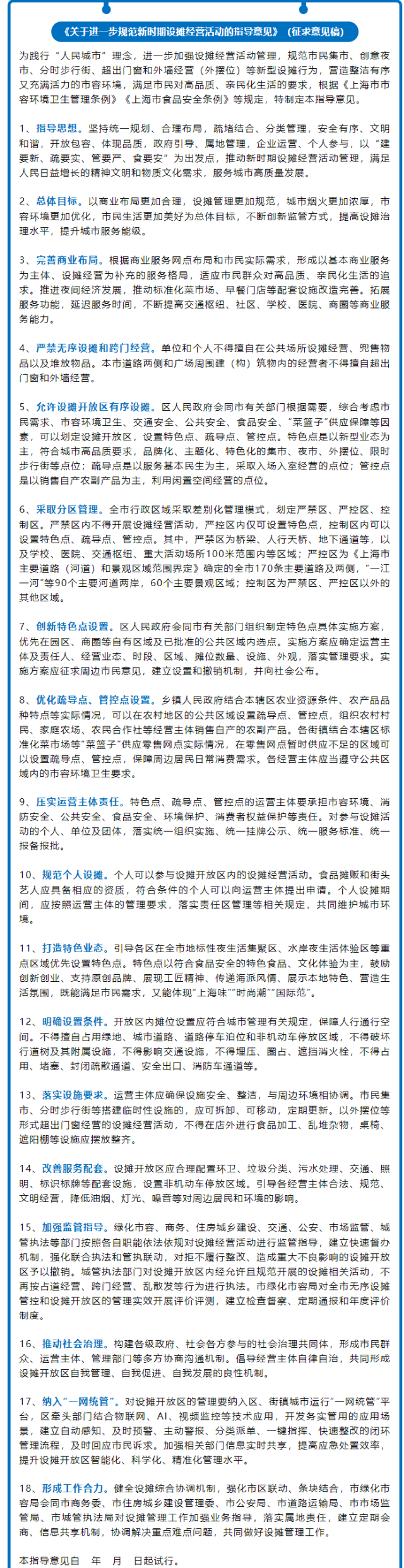 央視網消息:據“綠色上海”公眾號2月20日消息,根據《上海市市容環境衛生管理條例》,為進一步加強設攤經營活動管理,規范市民集市、創意夜市、分時步行街、超出門窗和外墻經營(簡稱外擺位)等新型設攤行為,結合上海市實際,上海市綠化和市容管理局經會同市相關部門研究,擬定了《關于進一步規范新時期設攤經營活動的指導意見》(征求意見稿),現面向社會公開征求意見。市民和各單位可以將書面意見直接寄送至上海市膠州路768號308室,郵編:200040;也可以發送電子郵件至shsrglc@126.com。征求意見截止日期:2023年3月22日。