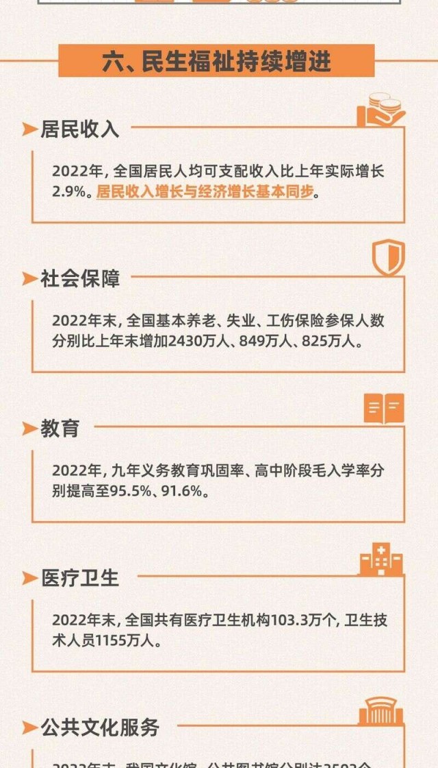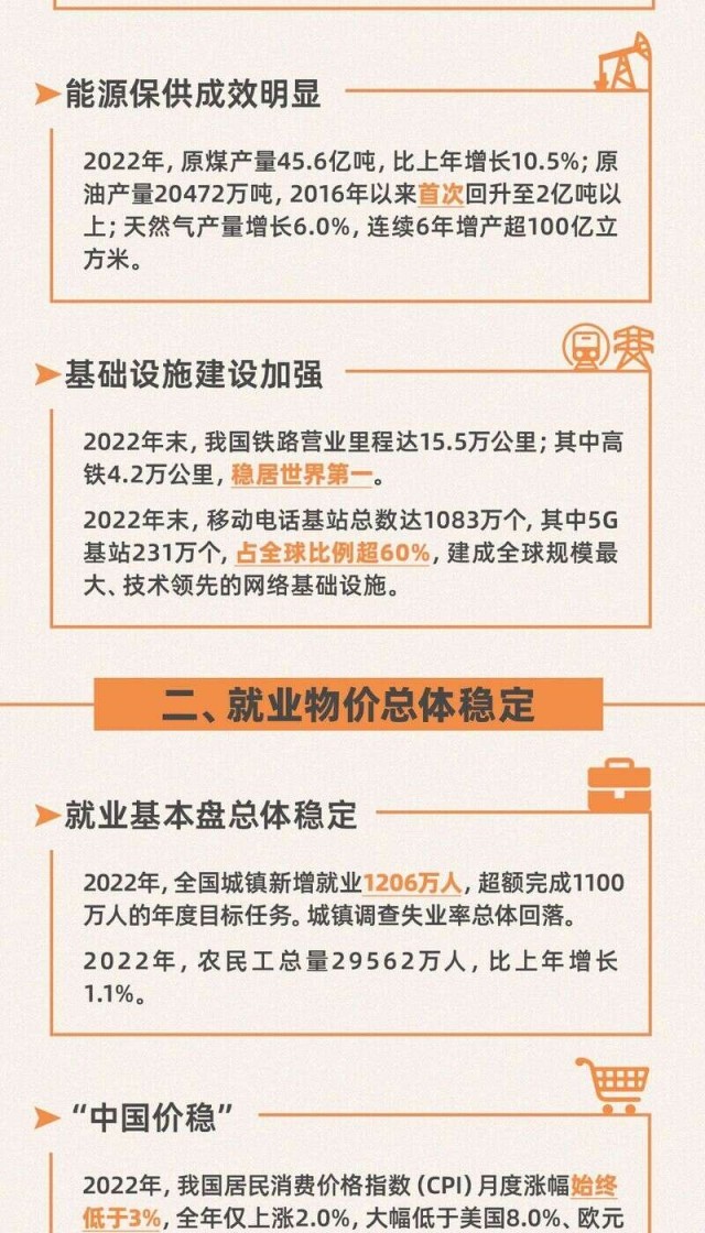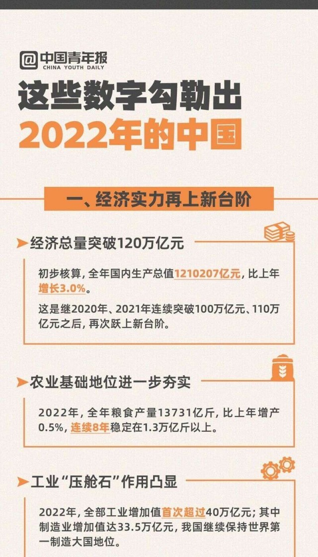 今日,國(guó)家統(tǒng)計(jì)局發(fā)布2022年國(guó)民經(jīng)濟(jì)和社會(huì)發(fā)展統(tǒng)計(jì)公報(bào)。初步核算,經(jīng)濟(jì)總量突破120萬(wàn)億元,再上新臺(tái)階;全年糧食產(chǎn)量連續(xù)8年穩(wěn)定在1.3萬(wàn)億斤以上;全部工業(yè)增加值首次超過40萬(wàn)億元;全國(guó)城鎮(zhèn)新增就業(yè)1206萬(wàn)人,超額完成年度目標(biāo)任務(wù);CPI月度漲幅始終低于3%;貨物進(jìn)出口總額首次突破40萬(wàn)億元大關(guān);引資規(guī)模再創(chuàng)新高;全國(guó)居民人均可支配收入實(shí)際增長(zhǎng)2.9%......轉(zhuǎn)存圖解,看看這些數(shù)字背后2022年的中國(guó)。