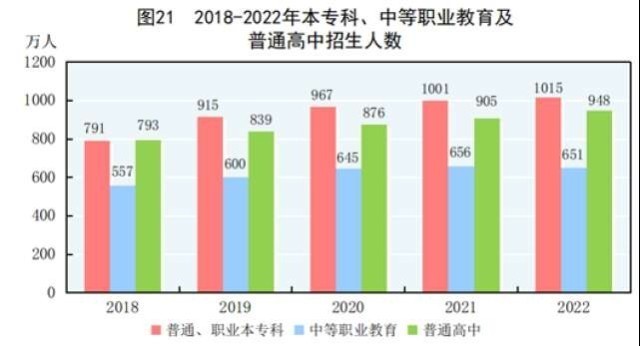 全年研究生教育招生124.2萬人,在學研究生365.4萬人,畢業生86.2萬人。普通、職業本專科招生1014.5萬人,在校生3659.4萬人,畢業生967.3萬人。中等職業教育招生650.7萬人,在校生1784.7萬人,畢業生519.2萬人。普通高中招生947.5萬人,在校生2713.9萬人,畢業生824.1萬人。初中招生1731.4萬人,在校生5120.6萬人,畢業生1623.9萬人。普通小學招生1701.4萬人,在校生10732.0萬人,畢業生1740.6萬人。特殊教育招生14.6萬人,在校生91.9萬人,畢業生15.9萬人。學前教育在園幼兒4627.5萬人。九年義務教育鞏固率為95.5%,高中階段毛入學率為91.6%。
