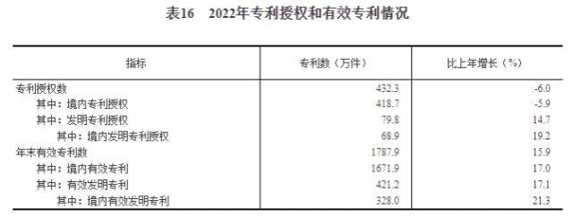 全年授予專利權432.3萬件,比上年下降6.0%;PCT專利申請受理量7.4萬件。截至年末,有效專利1787.9萬件,其中境內有效發明專利328.0萬件。每萬人口高價值發明專利擁有量9.4件。全年商標注冊617.7萬件,比上年下降20.2%。全年共簽訂技術合同77萬項,技術合同成交金額47791億元,比上年增長28.2%。我國公民具備科學素質的比例達到12.93%。