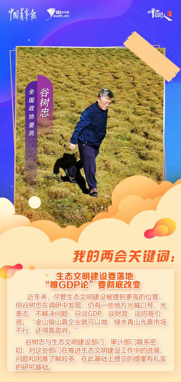 今年全國兩會,谷樹忠的提案依然圍繞生態文明建設,關注生態產品價值核算和生態修復等問題,“在當前穩增長、穩就業、穩物價的基礎上,生態環保工作也不能放松,要將綠水青山和金山銀山都兼顧起來”。