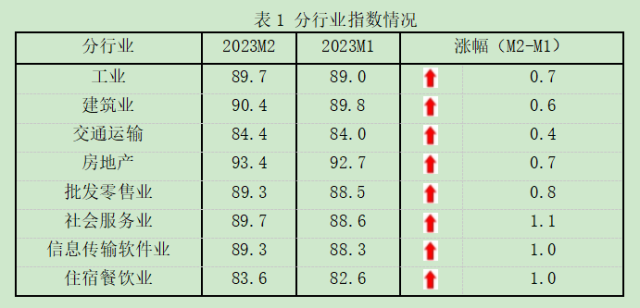 2月份,隨著經濟逐步恢復,8個行業指數均連續兩個月上升。服務業指數恢復速度領先,其中,社會服務業、信息傳輸計算機服務軟件業、住宿餐飲業和批發零售業指數分別上升1.1、1.0、1.0和0.8點。