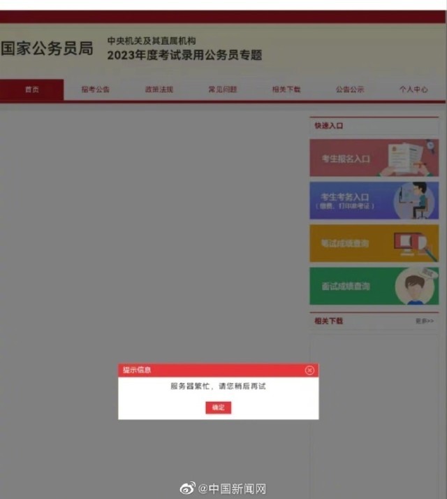 另據中新網報道,14日晚間,不少考生在網站曬出剛剛查到的2023國考筆試成績。一些網友反映2023國考專題網頁上分數查詢通道擁擠,網頁顯示“服務器繁忙”。