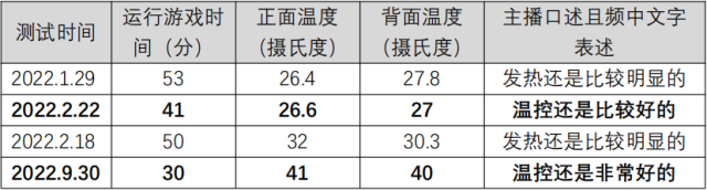 問題描述:博主于2022年1月至9月先后4次對不同手機進行溫度測試。在經過一定時間運行游戲后,使用測溫儀對手機正面及背面進行測溫,并對手機的溫控效果進行點評,4次測評結果出入較大,不同品牌的手機測評前后標準不一。