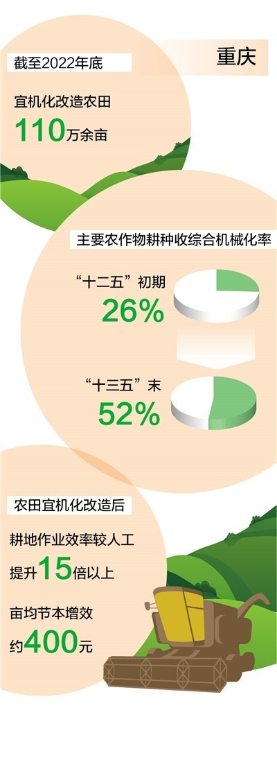 2015年起,重慶著眼于提升農業(yè)機械化水平,探索推進丘陵山區(qū)農田宜機化改造。截至2022年底,重慶已對110萬余畝農田進行了宜機化改造,主要農作物耕種收綜合機械化率由“十二五”初期的26%提高到“十三五”末的52%。