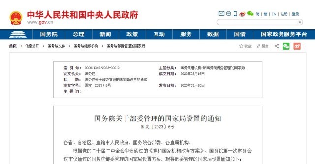 央視網消息:3月20日,《國務院關于部委管理的國家局設置的通知》發布。具體如下: