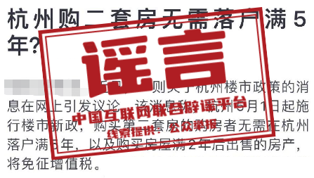 真相:近日,一則“杭州5月1日起施行樓市新政,購買第二套房的購房者無需落戶滿5年”的消息在網上流傳,引發關注。杭州市住房保障和房產管理局表示,這是一則假消息,杭州樓市因區施策,除臨安區不限購外,其他9個區均為限購區。(來源:經濟日報)